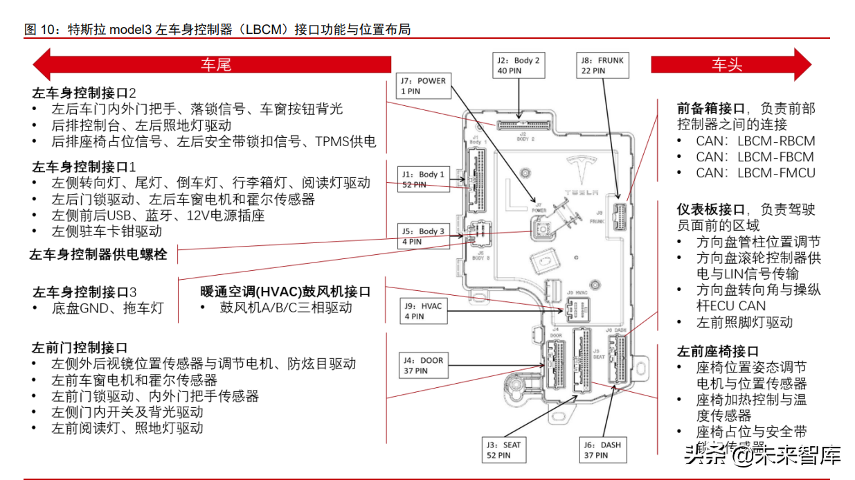 前车身控制器位于前舱中,主要负责的功能是前车体元件控制以及主要的配电工作。该控制器离蓄电池比较近,方便取电。其主要负责三类电子电气的配电和控制:1、安全相关:i-booster、ESP车身稳定系统、EPS助力转向、前向毫米波雷达;2、热管理相关:如冷却液泵、五通阀、换热器、冷媒温度压力传感器等;3、前车身其它功能:车头灯、机油泵、雨刮等。除此之外,它还给左右车身控制器供电,这一功能十分重要,因为左右车身控制器随后还将用这两个接口中的能量来驱动各自控制的车身零部件。