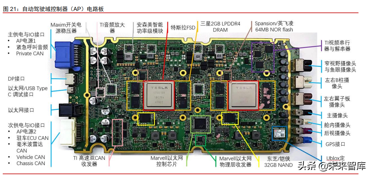 另外一点值得注意的是,为了保障驾驶安全,AP控制器必须时刻稳定运行,因此特斯拉在AP控制器中加入了相当大量的被动元件,正面有8颗安森美的智能功率模块,并搭配大量的电感和电容。背面更为明显,在几乎没有太多控制芯片的情况下将被动元件铺满整个电路板,密度之高远超其他控制器,也明显高于生活中各种常见的智能终端。从这一点来看,随着智能汽车的发展,我国被动元器件企业也有望获益。