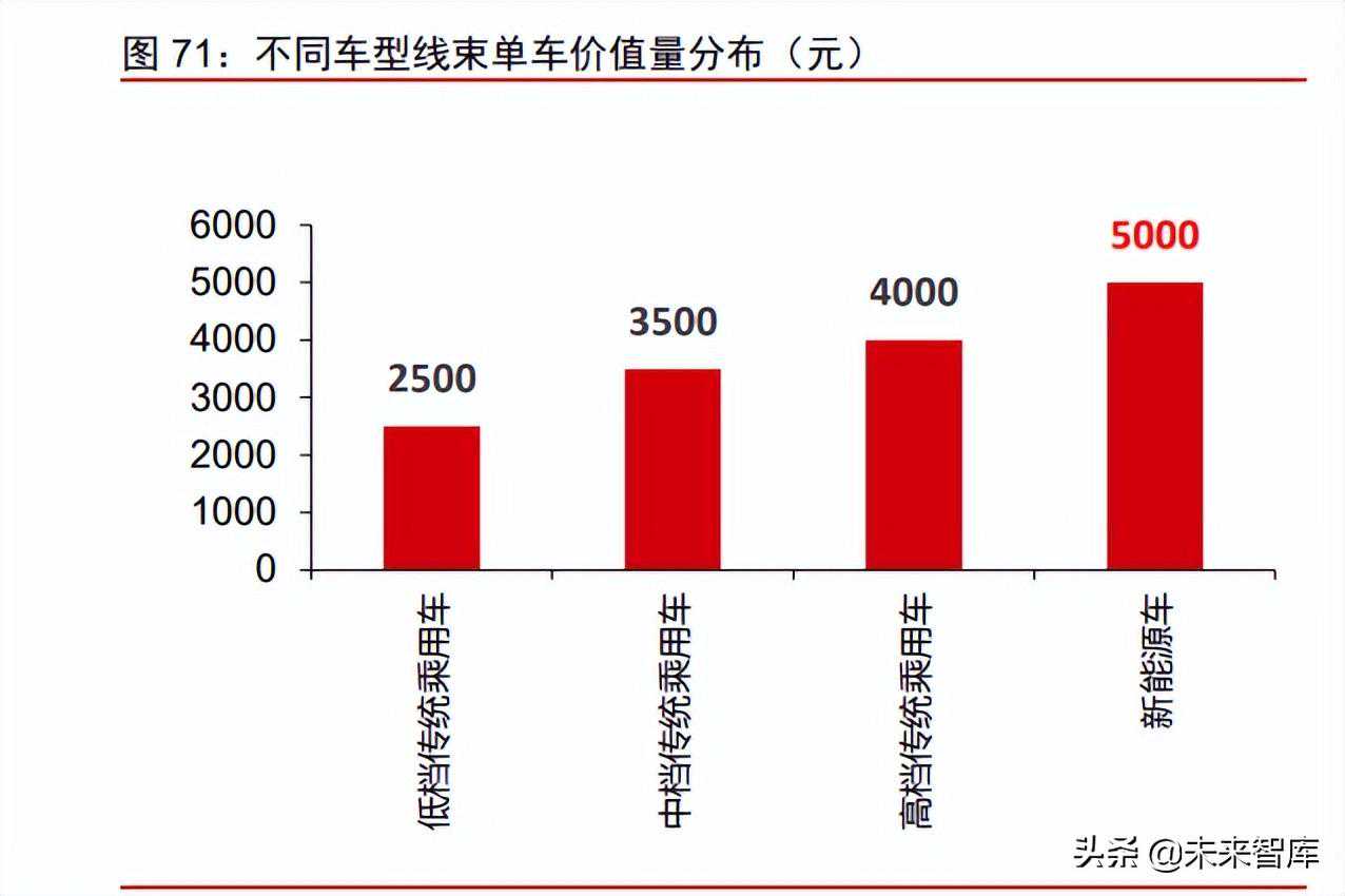 线束和连接器:高压线束和连接器是最大增量,集中式E/E架构减少线束用量线束:架构革新缩短线束长度,轻量化为车厂降本提效关键