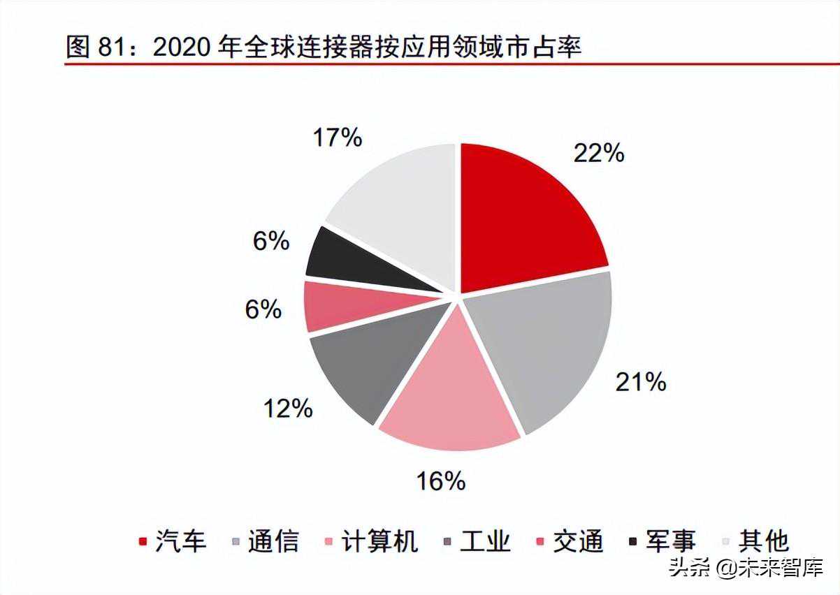 从竞争格局来看,汽车是连接器最大应用场景,行业竞争充分,海外龙头积淀深厚。2020年,汽车领域连接器规模占连接器总规模的22%,是最大的连接器细分市场,电气化与智能化趋势有望进一步提高汽车连接器市场空间。同时,行业内厂商头部化趋势愈加明显,1980年全球前10大连接器供应商的市场份额为38.0%,而在2019年前十大供应商的份额提升至60.2%。2019年全球前十大连接器厂商分别为泰科、安费诺、莫仕、安波福、鸿海精密、立讯精密、矢崎、JAE、JST、罗森伯格。
