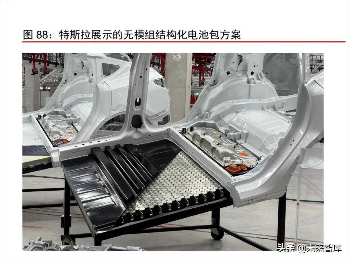集成度提升,减少非必要零件,降低成本,提高续航里程。在旧款的ModelS中,电池包采用16个小电池模组,分模组进行电池管理;在2022款ModelS中,电池包采用5块大模组方式集成,电池包中结构件数量减少,重量减轻,系统能量密度提升,在同样采用100kWh的1865电池的情况下,整车续航里程从335英里增加至405英里,提升21%;在最新的CTC技术中,直接由电芯作为车身的一部分,电池包上盖与车身地板融合,取消模组设计,进一步提高系统集成效率,成本降低6%,续航里程提高16%。