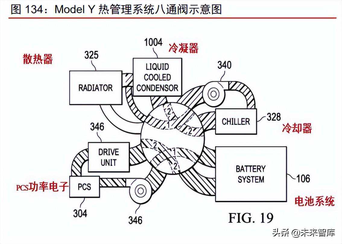 4)四代系统八通阀结构创新,热管理整车集成化。第四代热管理系统使用八通阀集成冷却和制热回路,实现整车热管理集成化。ModelY的热管理系统中使用了一个八通阀(Octovalve),引入热泵空调系统、空调系统和鼓风机电机的低效制热模式,将整车热管理集成化,并通过车载计算机精确的控制各元器件的运转情况。冷却环节,沿用三代冷却剂回路方案。通过冷却液循环系统,冷却液在各系统之间流动。在制热环节,采用热泵空调系统通过热交换器和管路连接,与电池回路和电机回路进行耦合,实现整个热管理系统的热量交互。