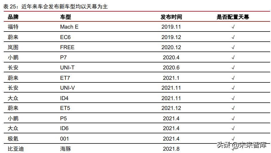 代传统天窗,特斯拉全景天幕引领行业趋势。2016年,特斯拉宣布旗下ModelS和Model3两大车型的最新款更换全景天幕玻璃。其中Model3采用了分段式的天幕玻璃,在车顶中部采用了加强横梁,对视野仍有一定的影响,而ModelS和ModelY更是取消了中间的横梁,采用了一体式的天幕玻璃。我们认为全玻璃车顶在造型设计上更加时尚和具有视觉冲击力,为车内提供更加广阔的视野,采光性能更好,乘坐体验提升显著。同时天幕玻璃省去电机、滑轨、齿轮等复杂结构后,制造成本更低。特斯拉所使用的天幕玻璃采用高强度的夹层玻璃保证安全,并通过镀膜技术阻挡近98%的紫外线和81%的热量进入车内。特斯拉的天幕设计受到了消费者的广泛好评,料将成为未来趋势。