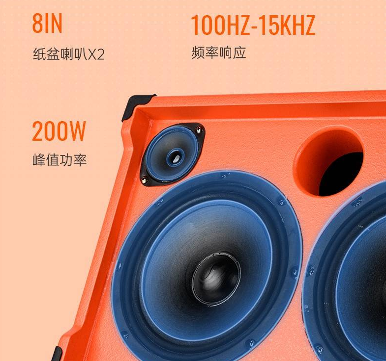 得胜OP-8弹唱音箱拥有2只8寸高性能纸盆喇叭,能输出200W大功率峰值,声音强劲。同时高性能发声单元,提供出色的高中低音,音质优美动听。