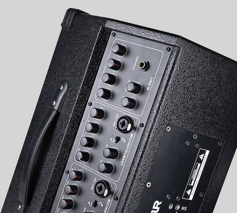 配有两路XLR话筒输入及一路吉他输入接口,可实现歌手边弹边唱。