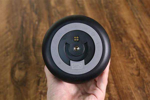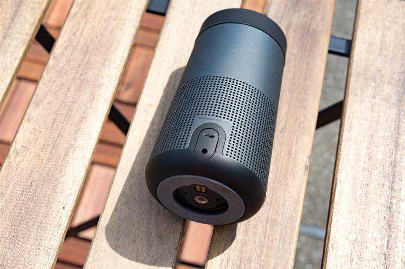 BOSESoundLinkRevolve+机身底部,排列着充电针脚与1/4螺口,支持底座充电,也方便使用三脚架架起音箱,提高音源位置的同时,还能防止与桌面共振造成的混响。