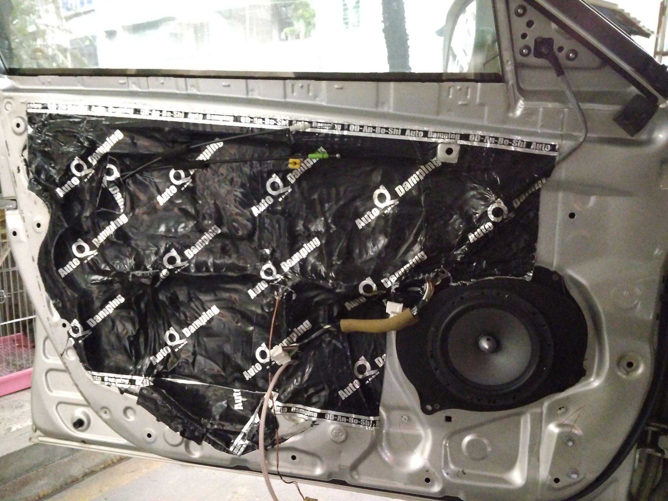 原车门板隔音措施并不是特别完善,因此鼎声改装技师使用安博士黑玉隔音材料对汽车的门板做了3层的隔音处理。这就相当于为声场喇叭制作了一个箱体一样,减少噪声对其的干扰,声音也变得厚实有力。