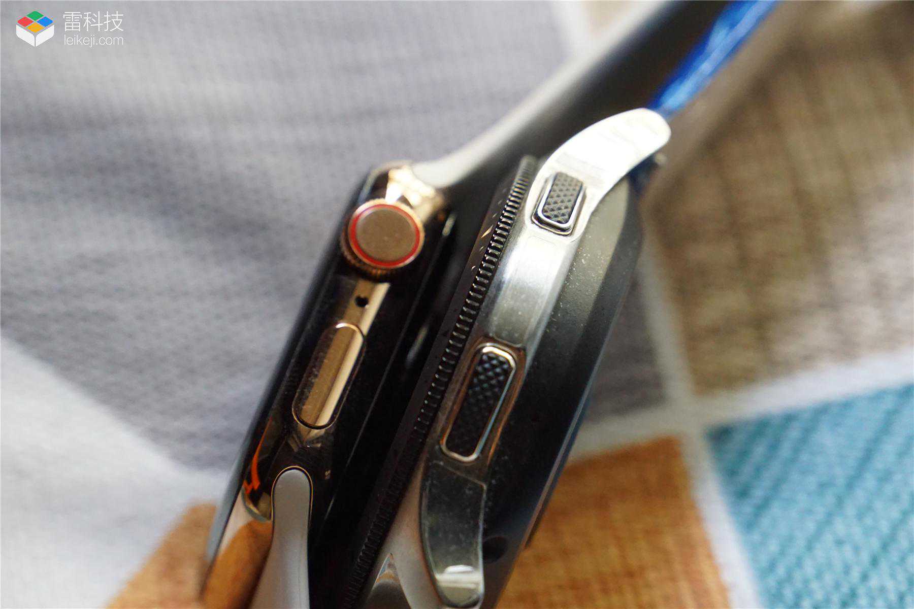 二者左侧都配备了扬声器用于外放声音,但不同的是GalaxyWatch的开孔其实是在背壳上,而AppleWatch则是在金属中框上。