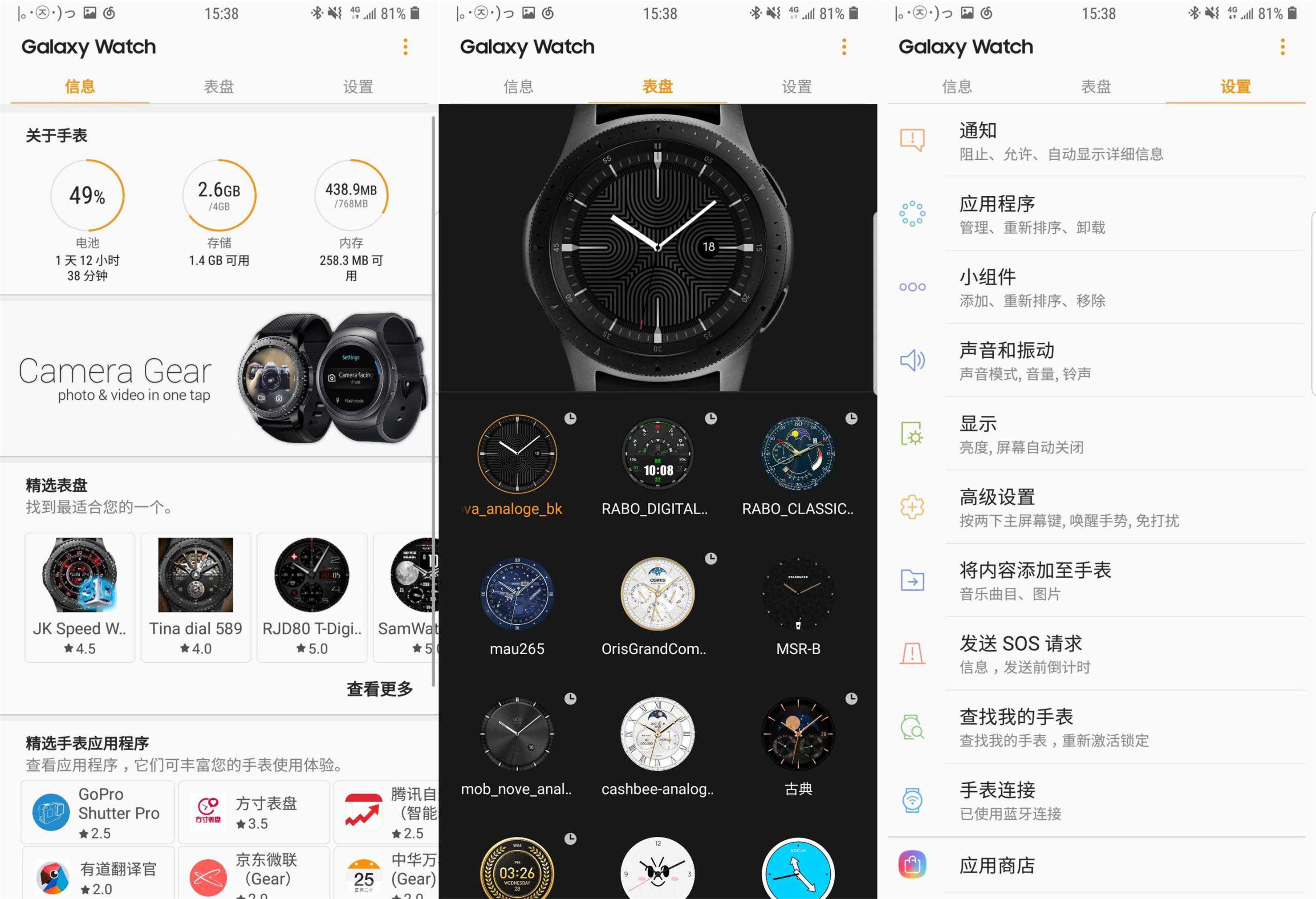 在手机应用上,三星GalaxyWatch是通过GalaxyWearableAPP配对和控制,其分为信息、表盘和设置三大块。支持显示手表剩余电池百分比、存储和运存等状态,直接切换表盘,对各项功能进行设置,还能直接导入音乐到手表内,通过内置存储空间播放本地歌曲。