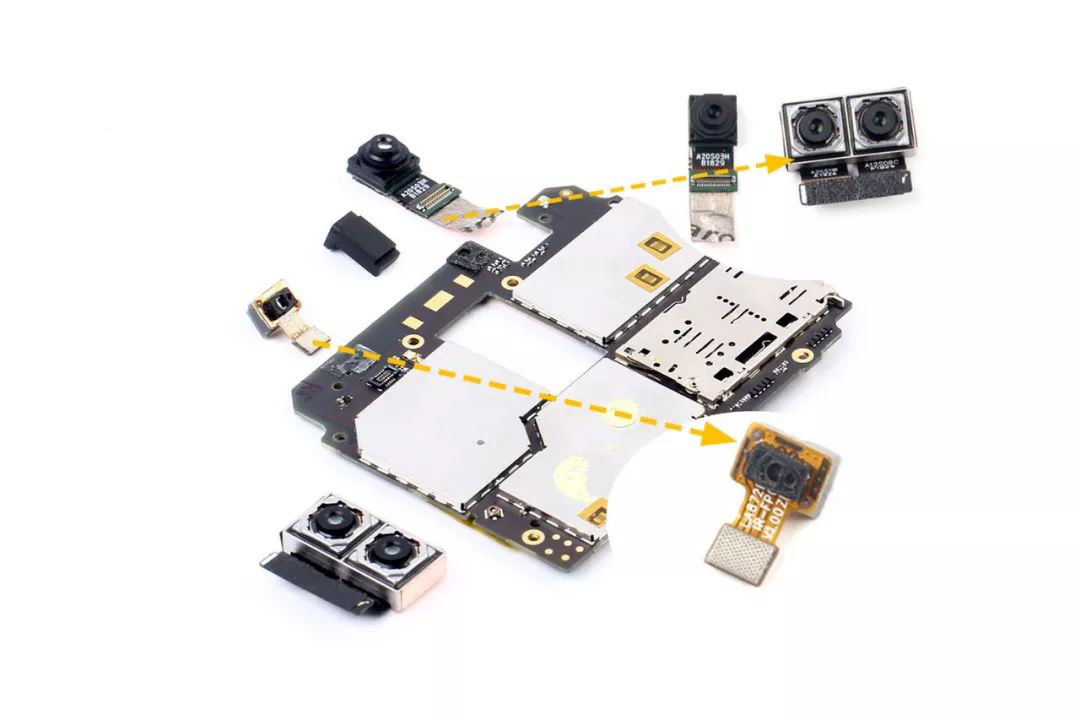 前后摄像头模块以及光线传感器都与主板直接相连,前后摄像头模组背面都贴有散热铜箔,光线传感器为独立模块,模块背面有一块塑胶物料作为缓冲,整个模块用双面胶固定在主板正面左上侧。