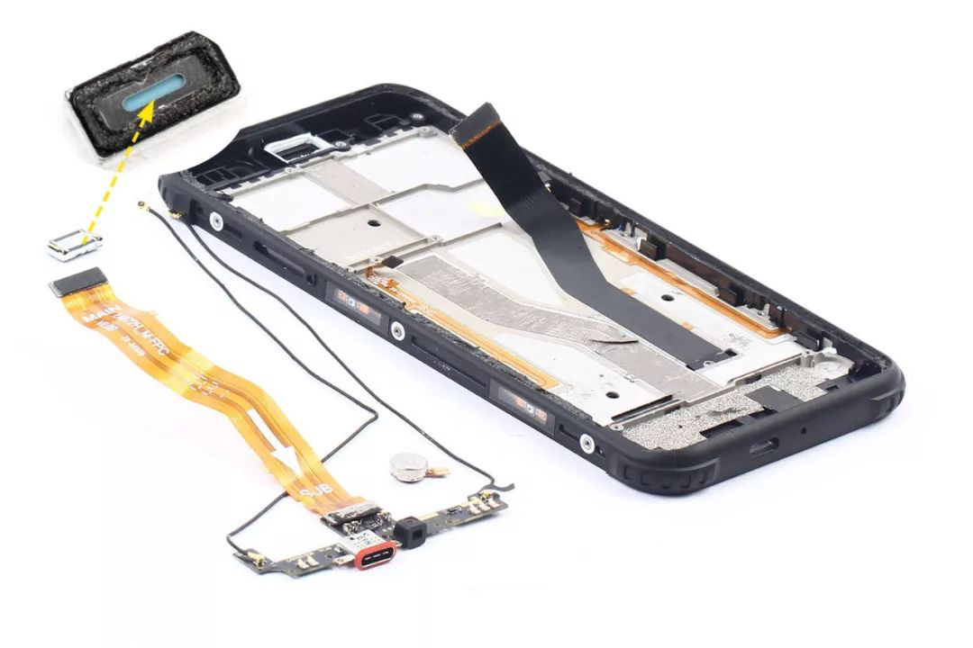 打开PC材质的主板保护盖,可以看到电池上的是无线充电/NFC感应线圈,保护盖上集成了LDS技术天线,手机底部放置着双音腔扬声器模块,扬声器出声孔位于手机的背面,出声孔表面配有防水薄膜以及防水泡棉,这个模块上同样也集成了LDS技术天线。此外,各个部件的BTB连接器表面都贴上了缓冲泡棉,防护设计十分到位。