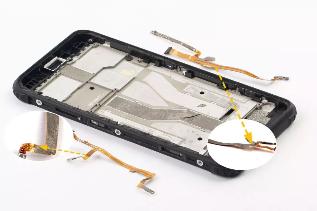 手机内部的部件基本拆卸完成,接下来就轮到屏幕部分。AGMX3采用的是一块6.0英寸的IPS屏幕,屏幕与中框之间采用防水泡棉胶进行粘合固定,取下屏幕后可以看到中框上贴有一大块石墨贴片帮助散热。中框上手机的四角设有防摔气囊结构。