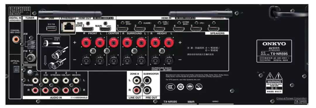 此外AM/FM收音机调谐器输入,用于连接电脑和储存的5V/1AUSB调试接口以及网线RJ45接口都可以在TX-NR595背面找到并使用。