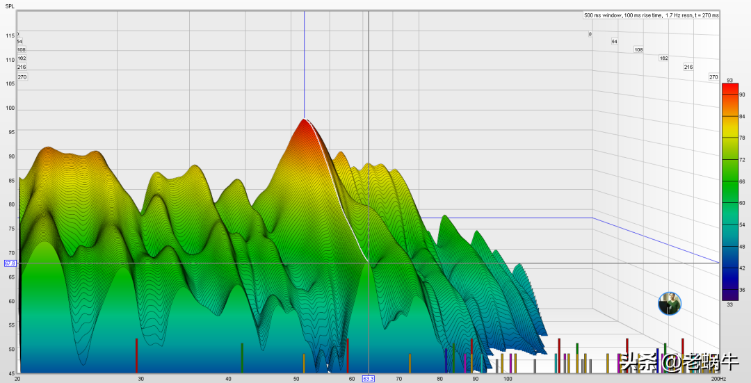 而且驻波或者叫房间模式是环境的固有问题,房间在模态谐振频率会经过反射叠加产生一个非常的频率响应,而且衰减会变得非常缓慢,比如下图就是在我家测得的,63Hz这个位置就更容易扰民。