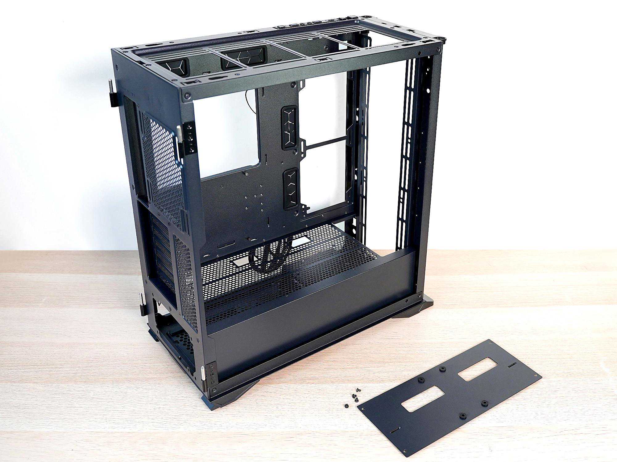 主板托架前面有一个3.5寸的硬盘架,拆下后可以侧放冷排。另外这种设计也让机箱可以放入一定尺寸的E-ATX主板,或者在前部进行分体水冷的安装。兼容性方面显卡限长400mm,风冷散限高180mm,预留空间是足够的。