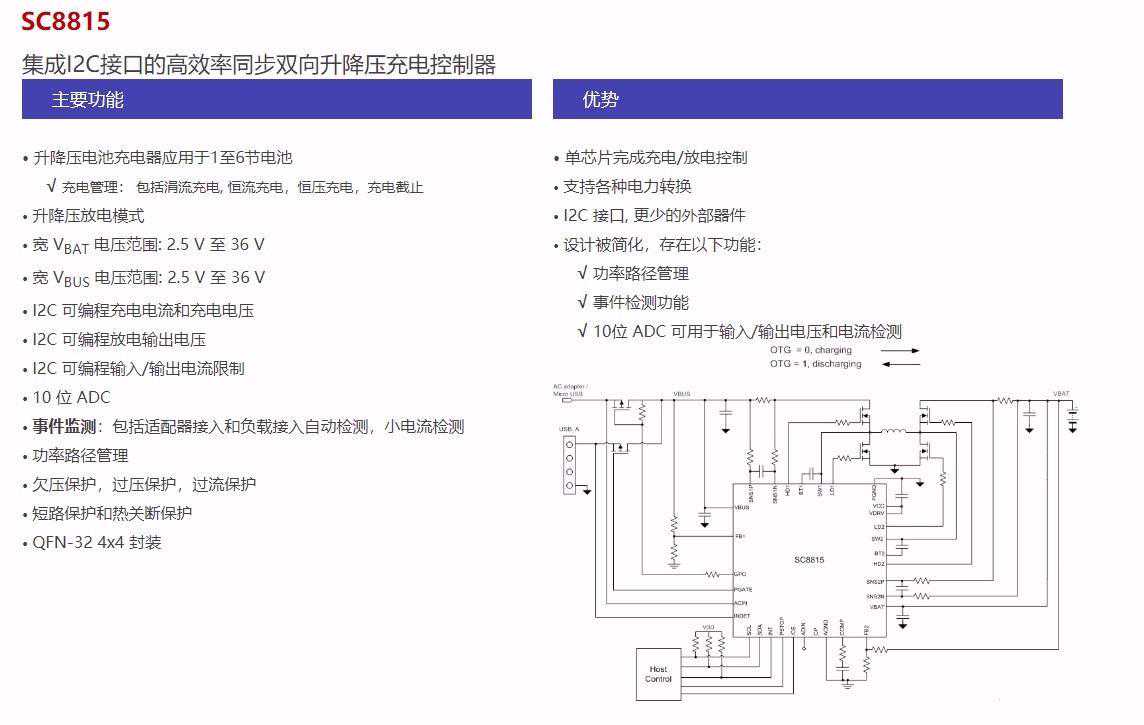 同步升降压控制器采用南芯半导体SC8815。这款芯片的I²C可编程充电电流和充电电压、可编程放电输出电压、可编程输入/输出电流限制;内置10位ADC;拥有欠压保护,过压保护,过流保护、短路保护和热关断保护等多种保护功能;单芯片完成充电/放电控制,支持各种电力转换。