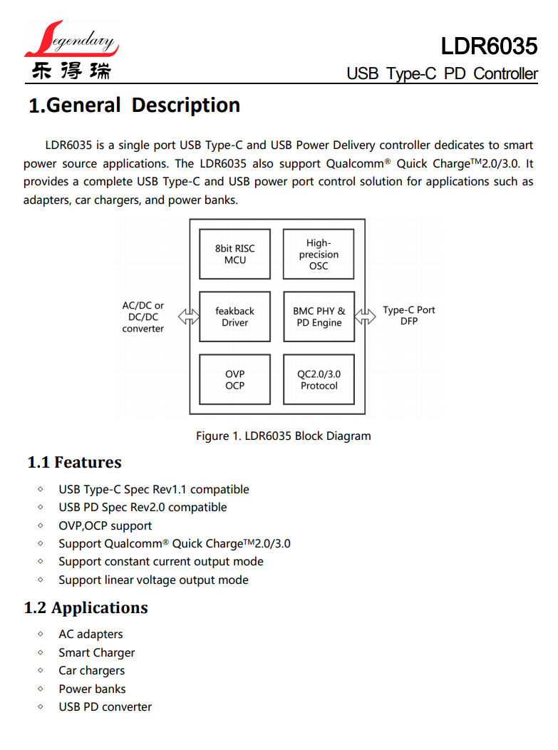乐得瑞LDR6035,单口USB-C控制器,支持/3.0,是完整的USB-C接口解决方案,适用于充电器、车充、移动电源。