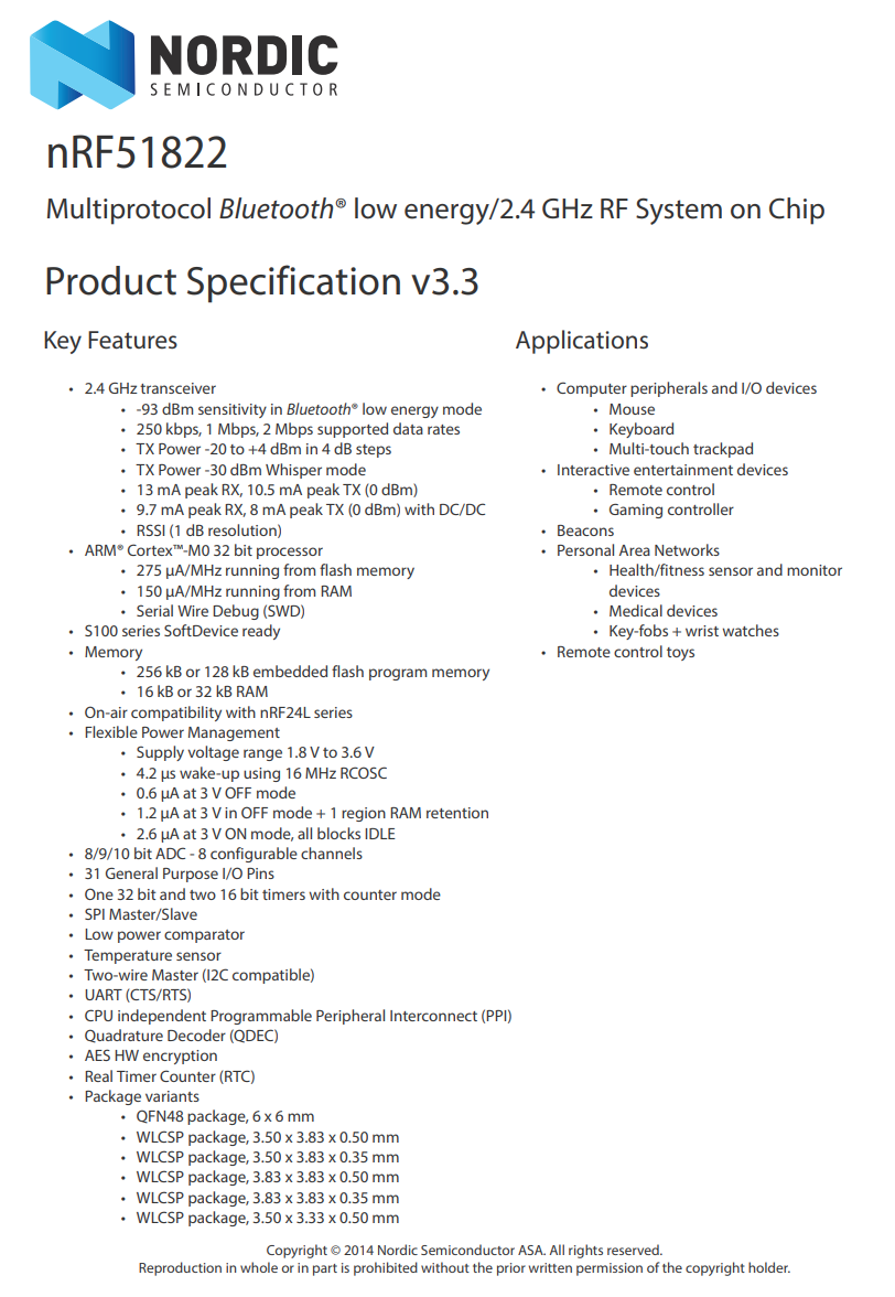 NORDIC单芯片蓝牙解决方案,nRF51822,支持多协议,用于蓝牙连接手机及屏幕显示驱动。