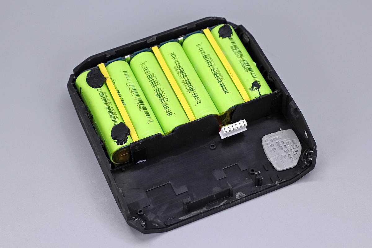 电池和保护电路板镍片点焊连接,PCB板上可以看到六颗相同的保护芯片,整个板子注塑保护。