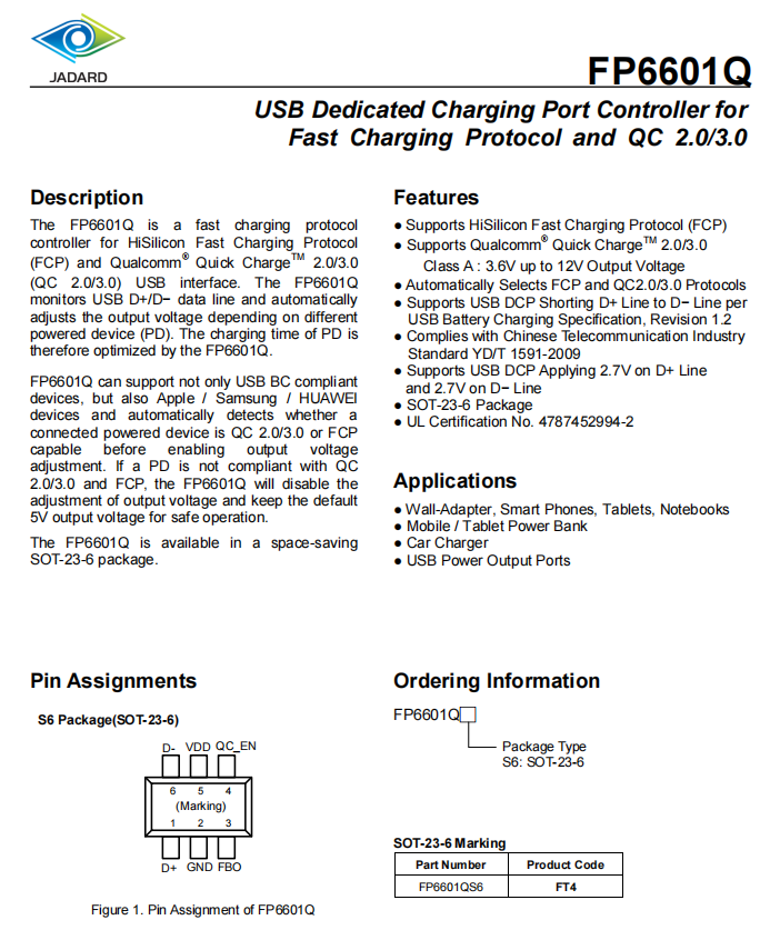 协议芯片采用天德钰FP6601Q,支持高通/2.0与华为FCP,通过监控USBD+/D-上的电压数据自动调整供电设备上的输出电压,互相握手识别后设备提升充电功率缩短充电时间。在本身就支持,和FCP的情况下,还能自动识别APPLE、三星、协议。