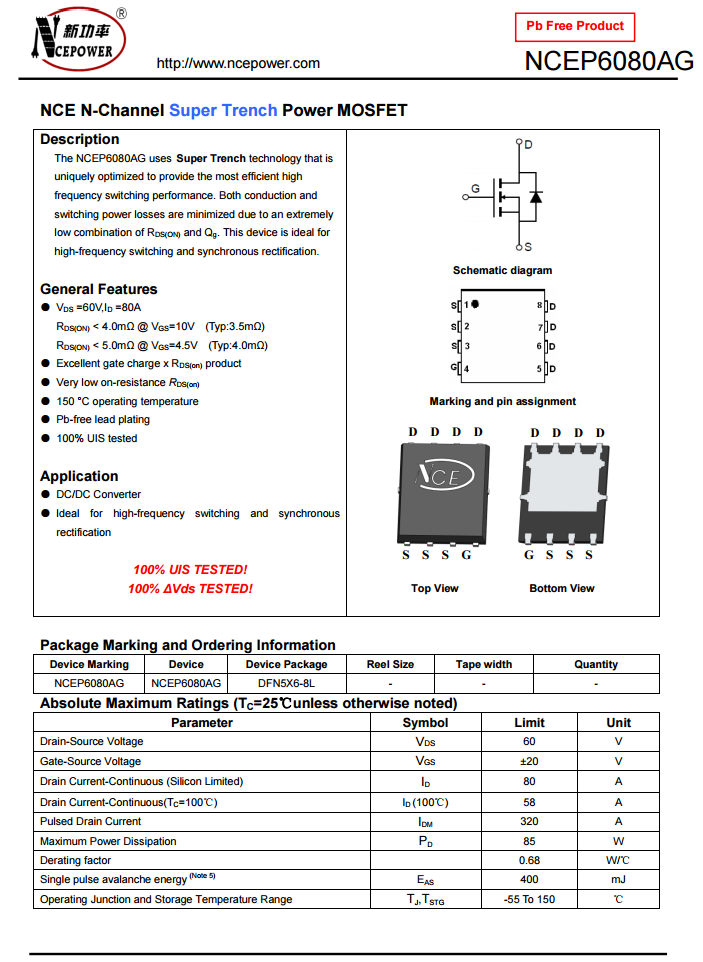 DC输入输出切换保护管采用新功率NCEP6080AG,耐压60V,DFN5x6-8L封装。