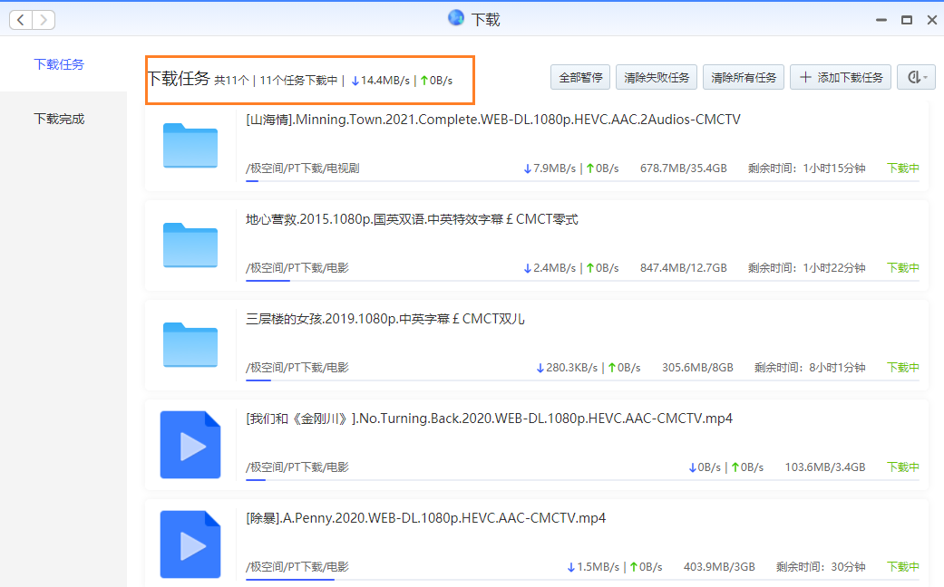7、我尝试用极空间的下载工具,下载了一些PT上的资源,速度也是非常的快!