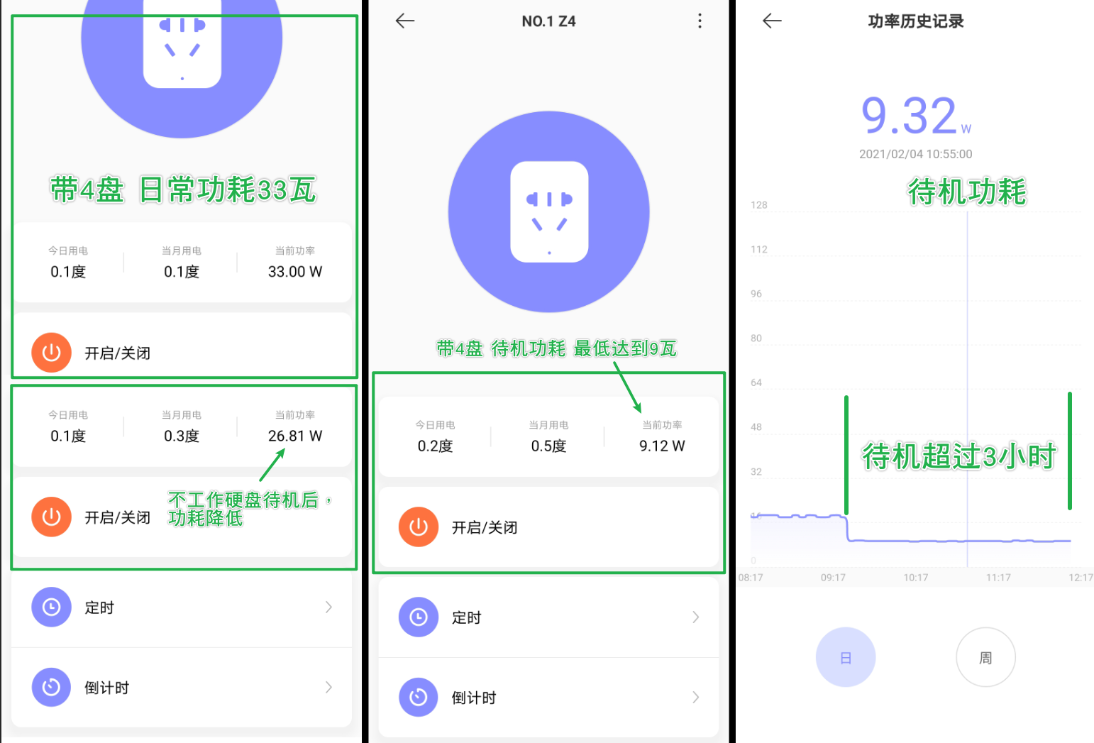 最让我震惊的是待机功耗,4个硬盘都待机后,整机功耗只有9瓦,而且持续的待机时间超长: