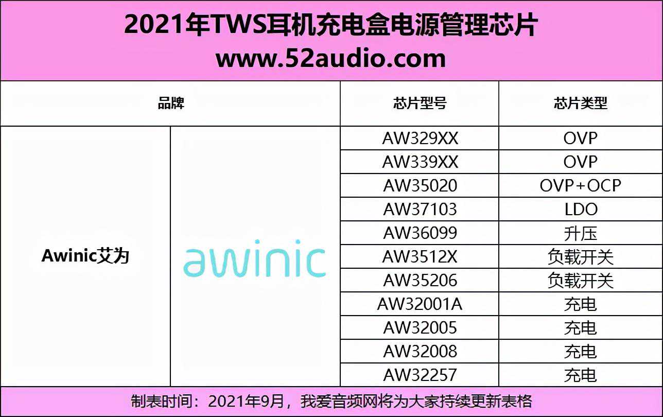 此前我爱音频网为大家汇总整理了2021年TWS耳机蓝牙音频SoC,此次再来为大家分享一下2021年TWS耳机充电盒电源管理芯片,包含了23家电源芯片厂商推出的138款电源管理芯片产品,下面来看看都有哪些产品使用了哪些充电盒电源管理芯片吧~
