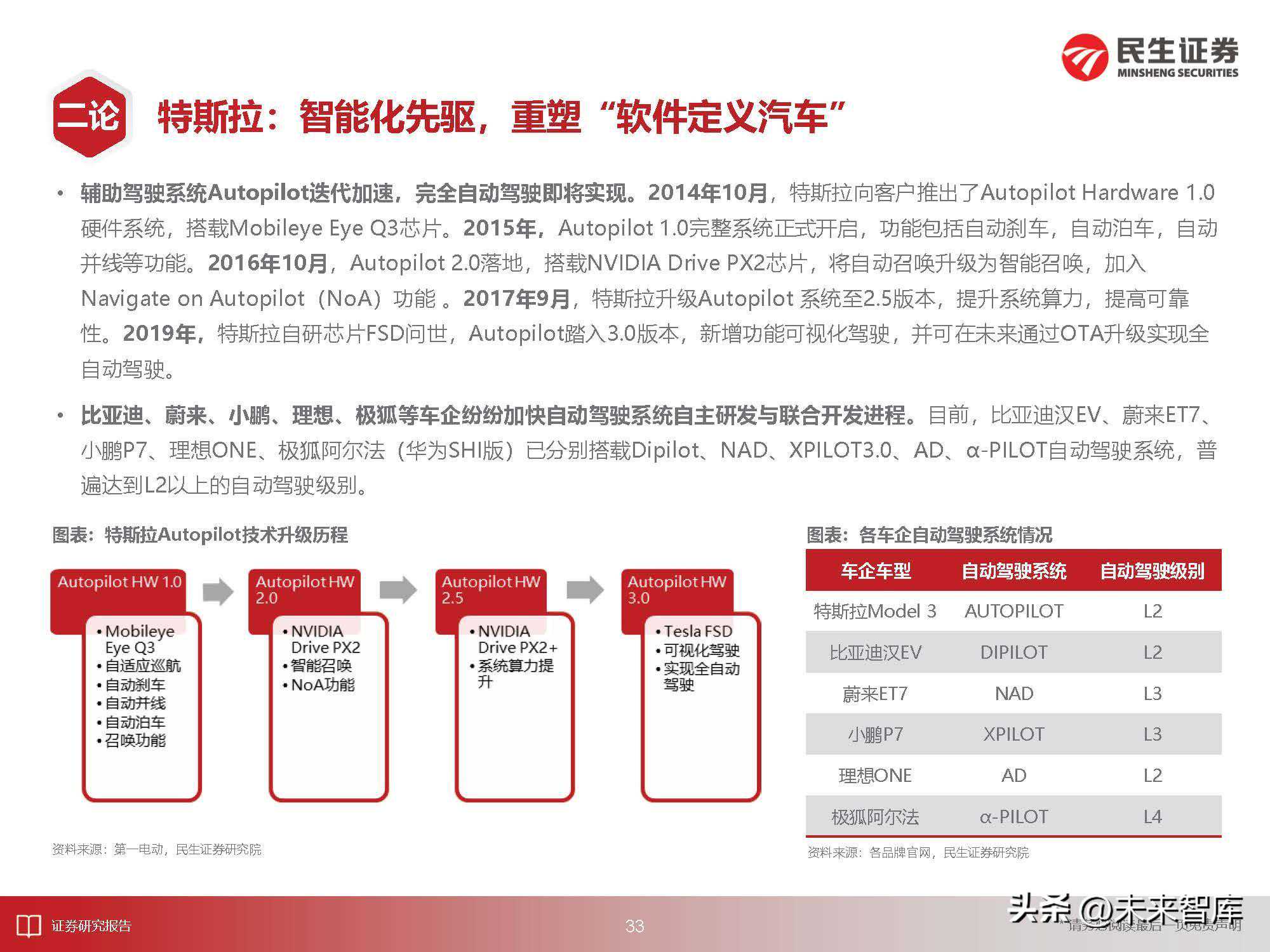 辅助驾驶系统Autopilot迭代加速,完全自动驾驶即将实现。2014年10月,特斯拉向客户推出了硬件系统,搭载MobileyeEyeQ3芯片。2015年,完整系统正式开启,功能包括自动刹车,自动泊车,自动并线等功能。2016年10月,落地,搭载NVIDIADrivePX2芯片,将自动召唤升级为智能召唤,加入NavigateonAutopilot(NoA)功能。2017年9月,特斯拉升级Autopilot系统至2.5版本,提升系统算力,提高可靠性。2019年,特斯拉自研芯片FSD问世,Autopilot踏入3.0版本,新增功能可视化驾驶,并可在未来通过OTA升级实现全自动驾驶。