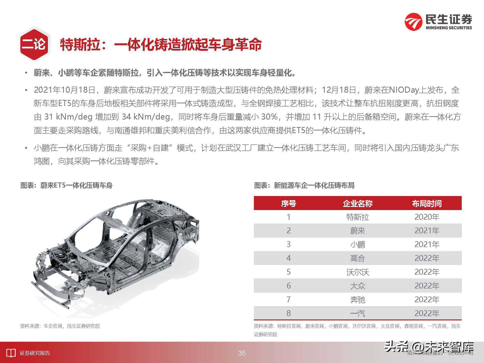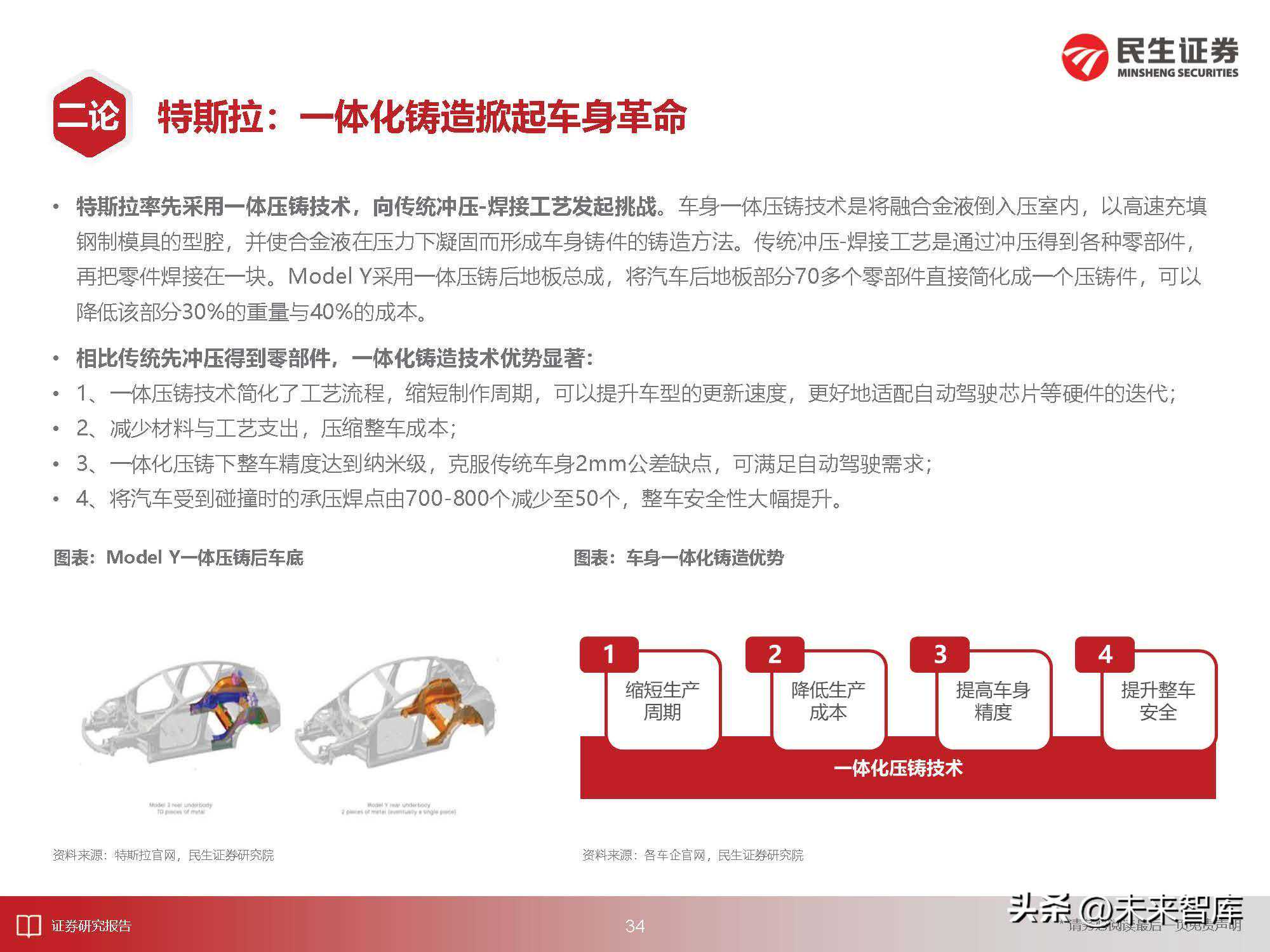 特斯拉率先采用一体压铸技术,向传统冲压-焊接工艺发起挑战。车身一体压铸技术是将融合金液倒入压室内,以高速充填钢制模具的型腔,并使合金液在压力下凝固而形成车身铸件的铸造方法。传统冲压-焊接工艺是通过冲压得到各种零部件,再把零件焊接在一块。ModelY采用一体压铸后地板总成,将汽车后地板部分70多个零部件直接简化成一个压铸件,可以降低该部分30%的重量与40%的成本。