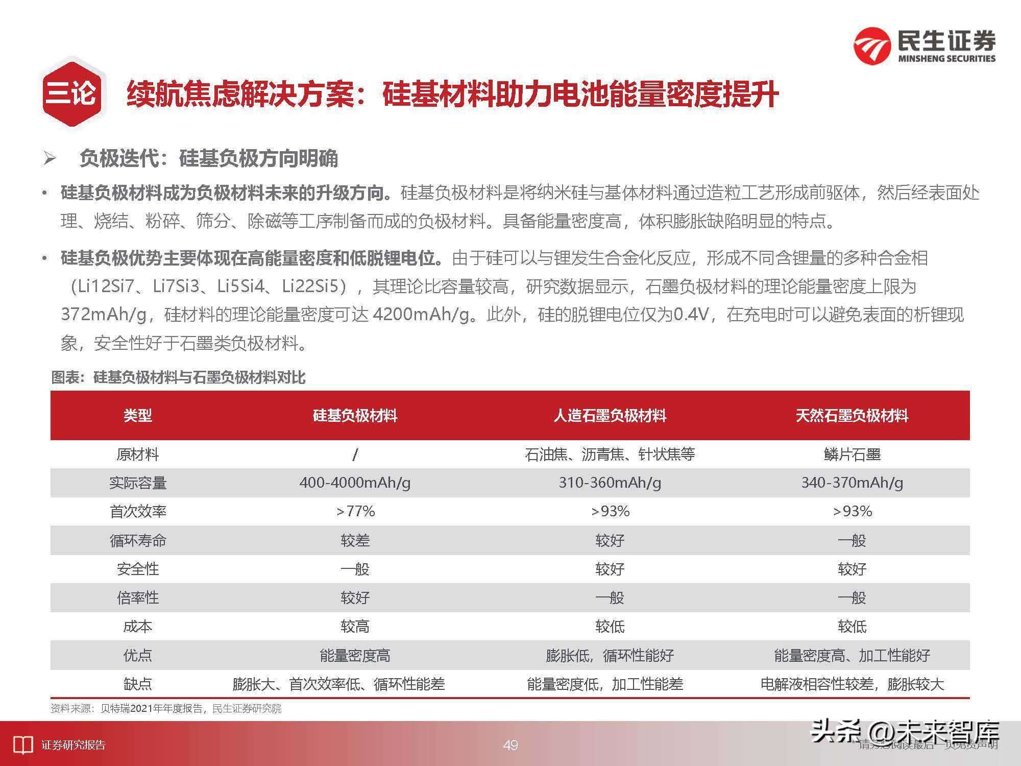 硅基负极优势主要体现在高能量密度和低脱锂电位。由于硅可以与锂发生合金化反应,形成不同含锂量的多种合金相(Li12Si7、Li7Si3、Li5Si4、Li22Si5),其理论比容量较高,研究数据显示,石墨负极材料的理论能量密度上限为372mAh/g,硅材料的理论能量密度可达4200mAh/g。此外,硅的脱锂电位仅为0.4V,在充电时可以避免表面的析锂现象,安全性好于石墨类负极材料。
