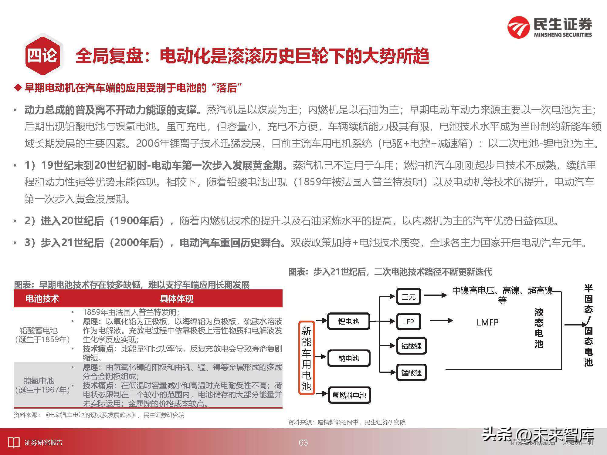 全局复盘:电动化是滚滚历史巨轮下的大势所趋早期电动机在汽车端的应用受制于电池的“落后”