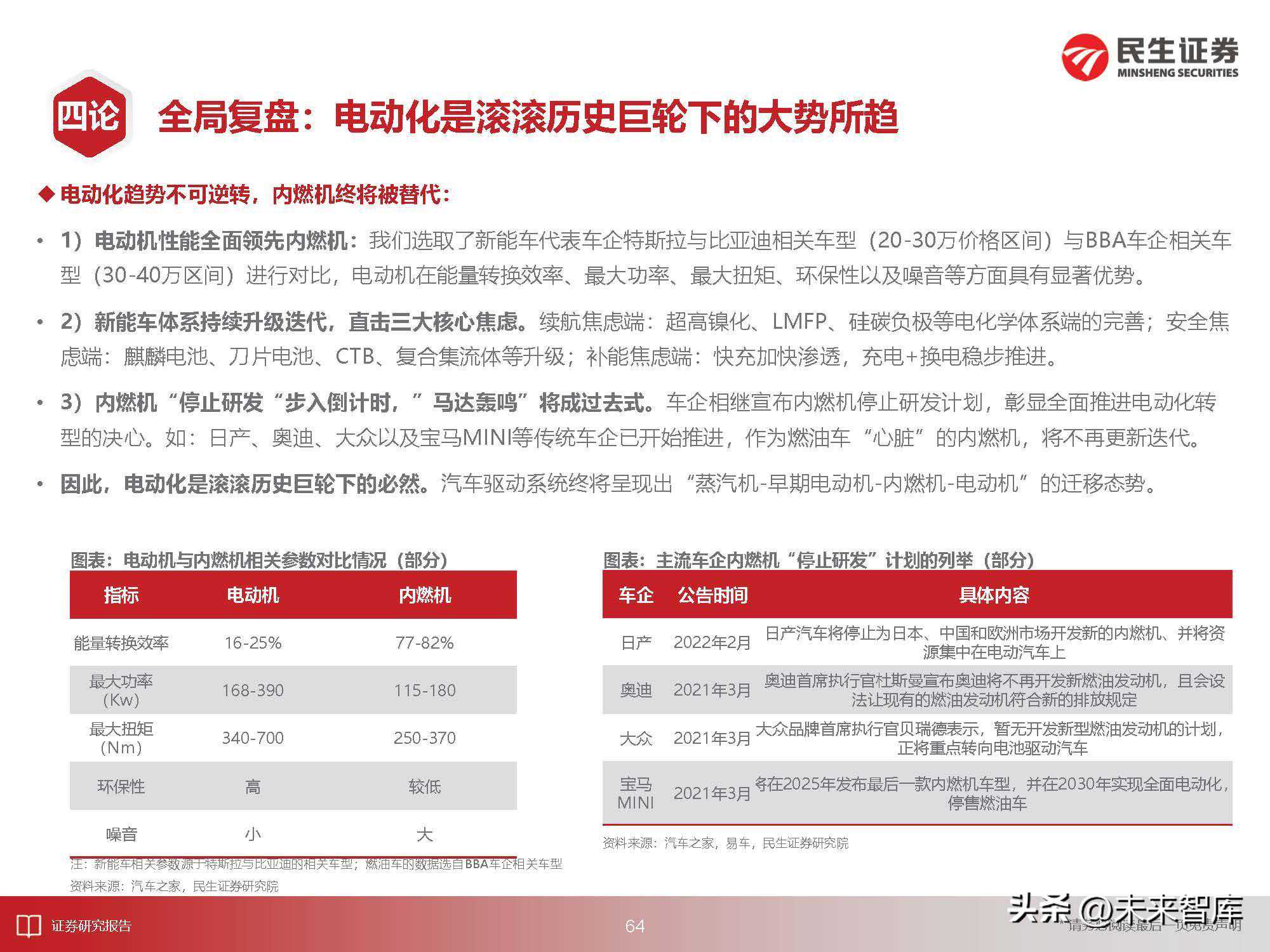电动化趋势不可逆转,内燃机终将被替代:1)电动机性能全面领先内燃机:我们选取了新能车代表车企特斯拉与比亚迪相关车型(20-30万价格区间)与BBA车企相关车型(30-40万区间)进行对比,电动机在能量转换效率、最大功率、最大扭矩、环保性以及噪音等方面具有显著优势。2)新能车体系持续升级迭代,直击三大核心焦虑。续航焦虑端:超高镍化、LMFP、硅碳负极等电化学体系端的完善;安全焦虑端:麒麟电池、刀片电池、CTB、复合集流体等升级;补能焦虑端:快充加快渗透,充电+换电稳步推进。3)内燃机“停止研发“步入倒计时,”马达轰鸣”将成过去式。车企相继宣布内燃机停止研发计划,彰显全面推进电动化转型的决心。如:日产、奥迪、大众以及宝马MINI等传统车企已开始推进,作为燃油车“心脏”的内燃机,将不再更新迭代。因此,电动化是滚滚历史巨轮下的必然。汽车驱动系统终将呈现出“蒸汽机-早期电动机-内燃机-电动机”的迁移态势。