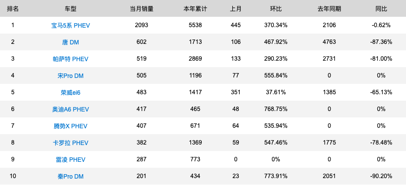 3月份的插电式混合动力销量排行榜中,宝马5系PHEV销量为2093辆,继续位居第一,较去年同期下降0.62%。