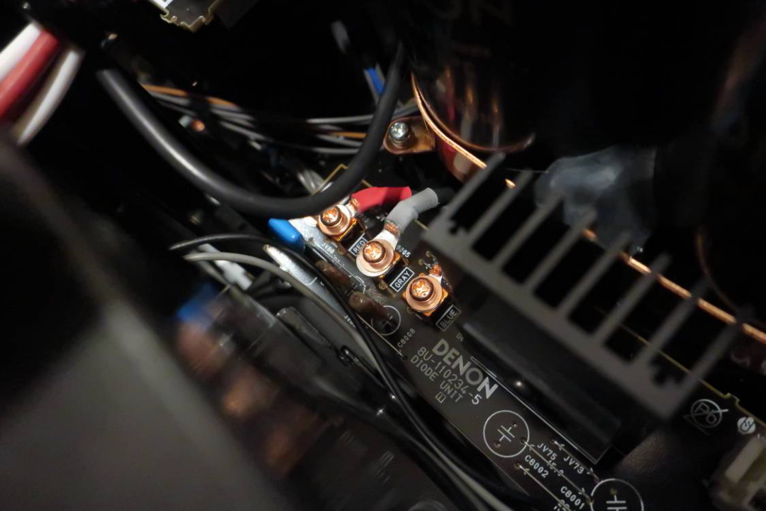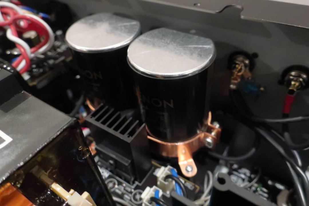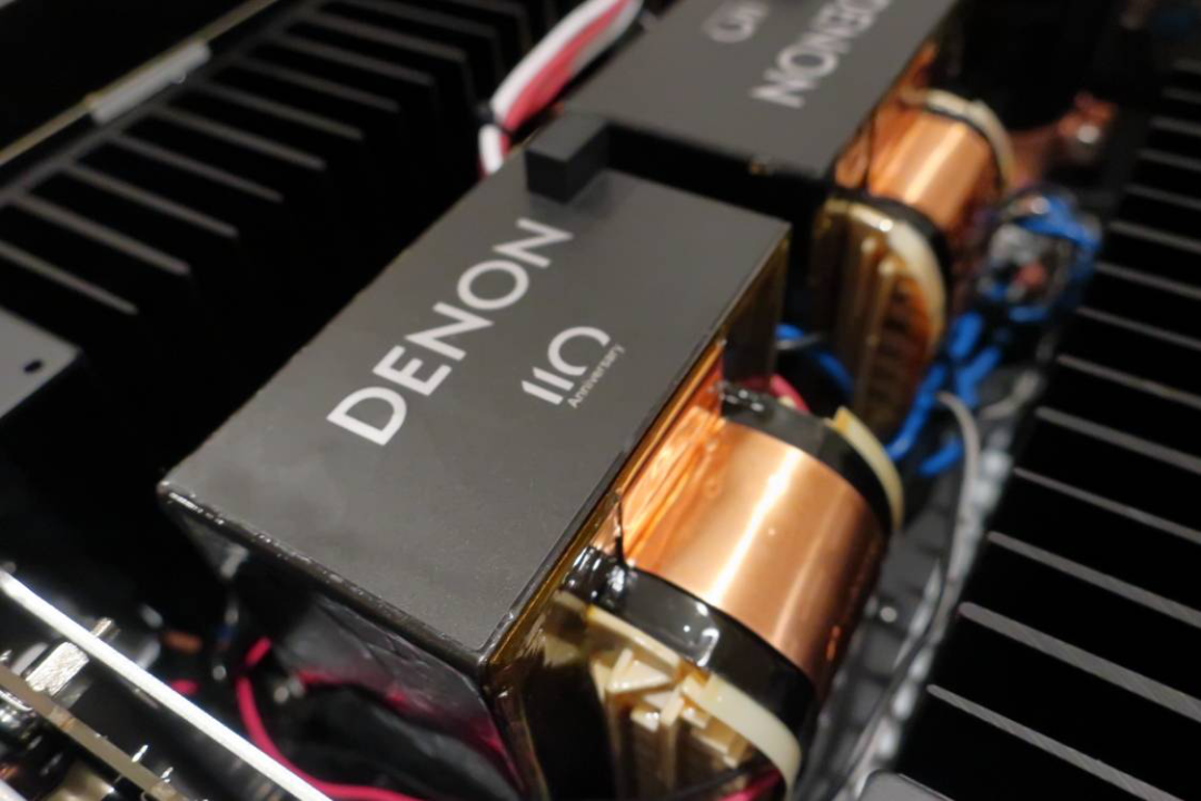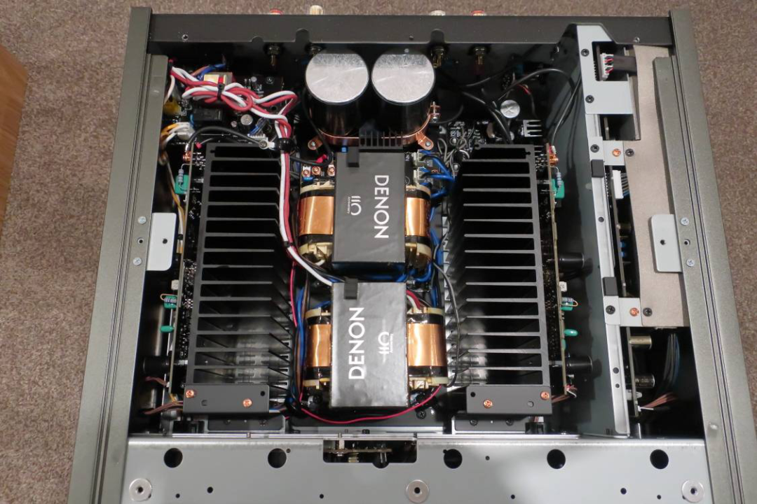 空间中的最大部分被第7代超大电流放大模块的散热器占用,这些模块使用MOS-FET功率管和推挽式电路设计,先进的超高电流技术中的两级差分功放。Denon依靠输出高电流的能力,能够驱动向更复杂的扬声器。在信噪比超过110dB时,功放可产生功率80W/8Ω(20–20000Hz,总谐波失真THD低于0.07%)。