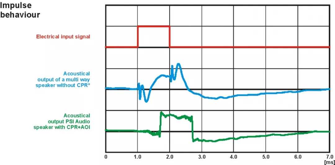 如下图所示,标准扬声器响应可能会再现方波信号中使用的频率,但由于滤波器(声学,机械和电子)延迟了低频,因此不会考虑时序。结果,扬声器将开始再现高频并且低频将跟随,然后高频将停止并且低频将稍后停止。