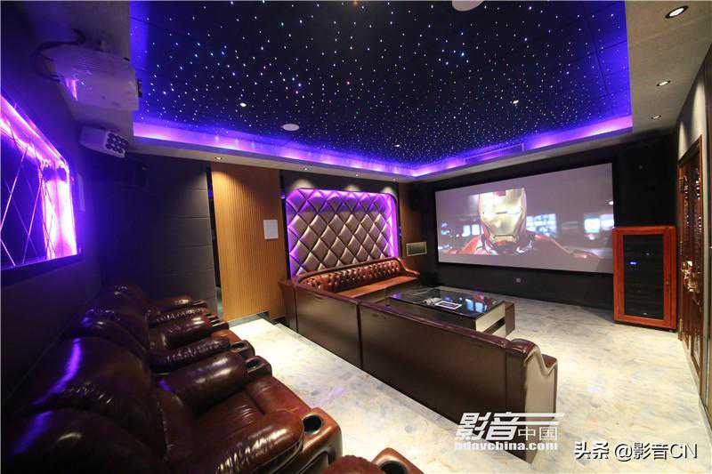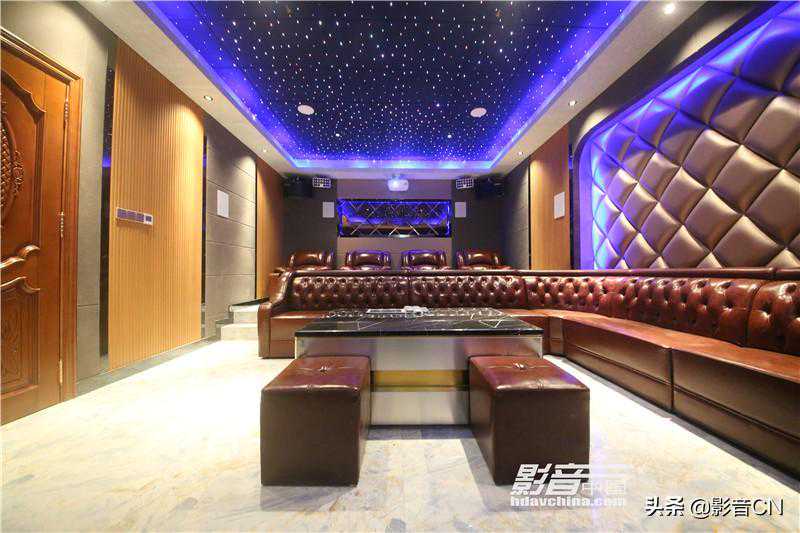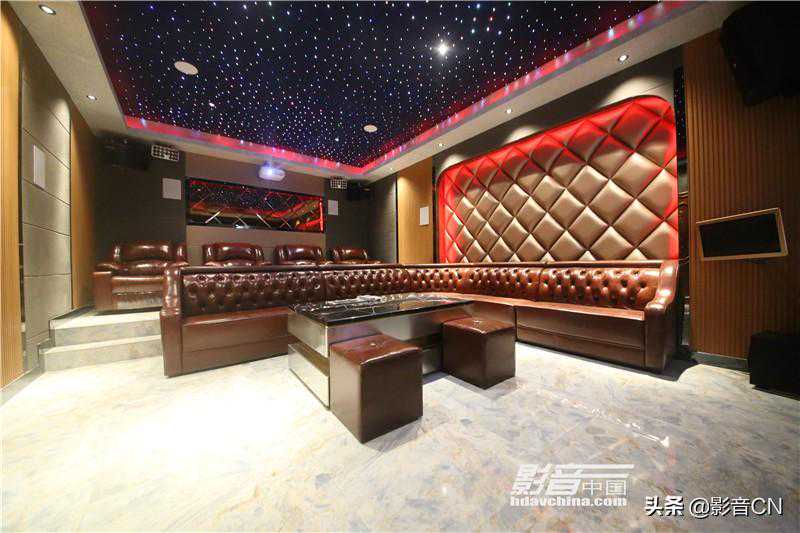 影音室四面墙身、天花、地面均以专业声学装修建设,于装修结构内部做专业声学处理,于装修表面做精美外饰面及风格处理,做到内部硬件有作为,外部装修有设计的特点。两排座椅沙发,拓展延伸的大空间设计,让人心旷神怡,配合神秘庄严的星空顶,比商业影院更带感,观影体验更美妙。
