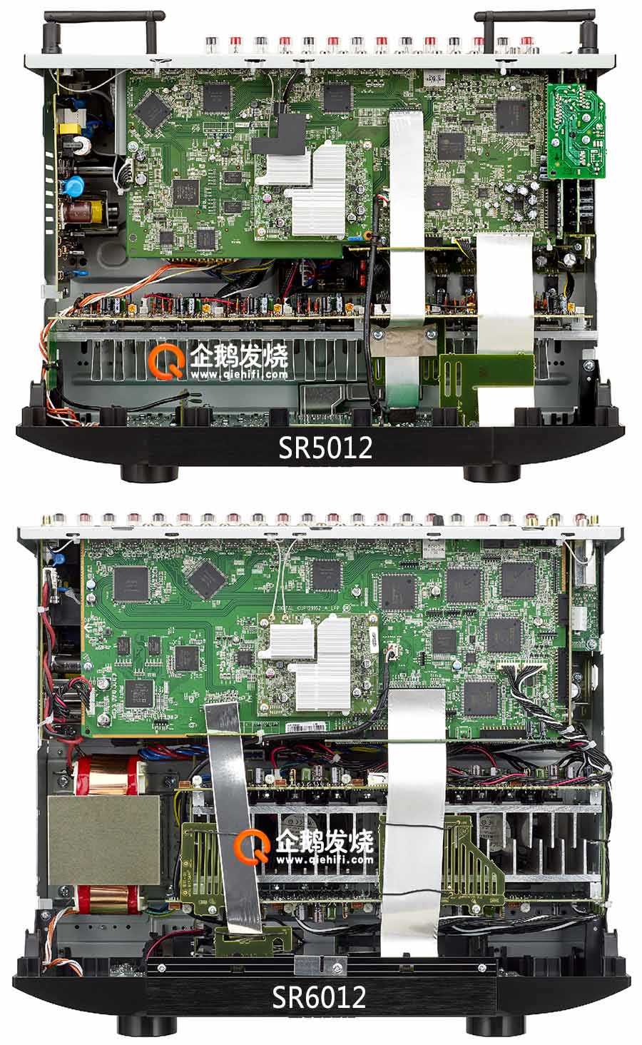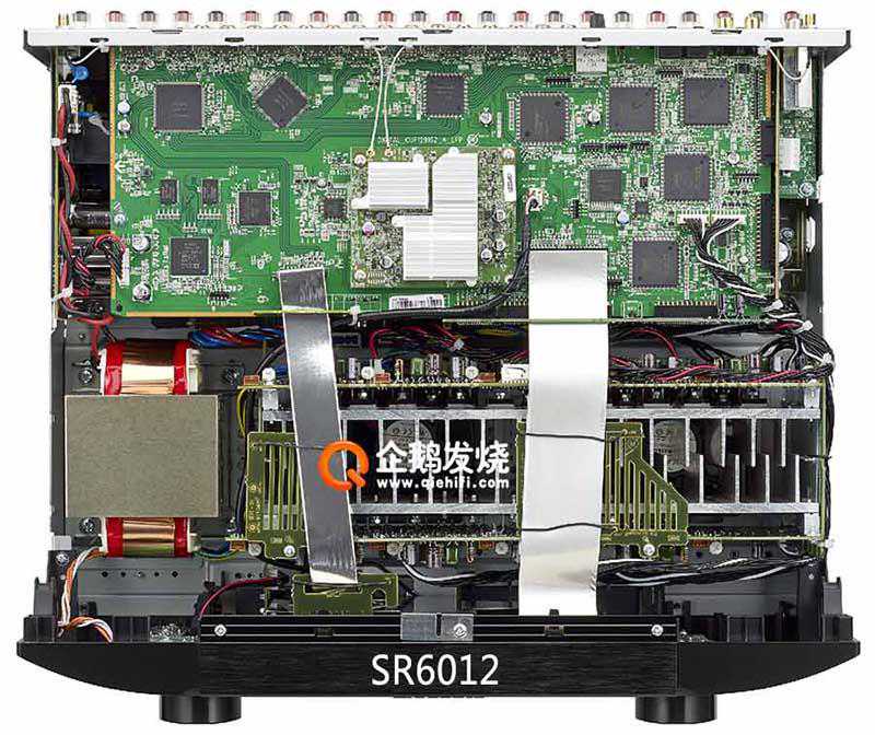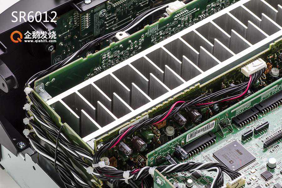 SR5012与SR6012虽然是产品线上相邻的两款功放,但内部布局显然不同。SR5012的进深比SR6012明显短了一些。机箱内的散热片也明显不同。SR5012只有7个声道,一组大型散热片;SR6012有11个声道,1组散热片空间不够,所以分成了两组散热片。而且,SR6012散热鳍片也要厚实的多,在散热片底部还有两只温控风扇,防止机内温度过高。而SR5012内部没有散热风扇。