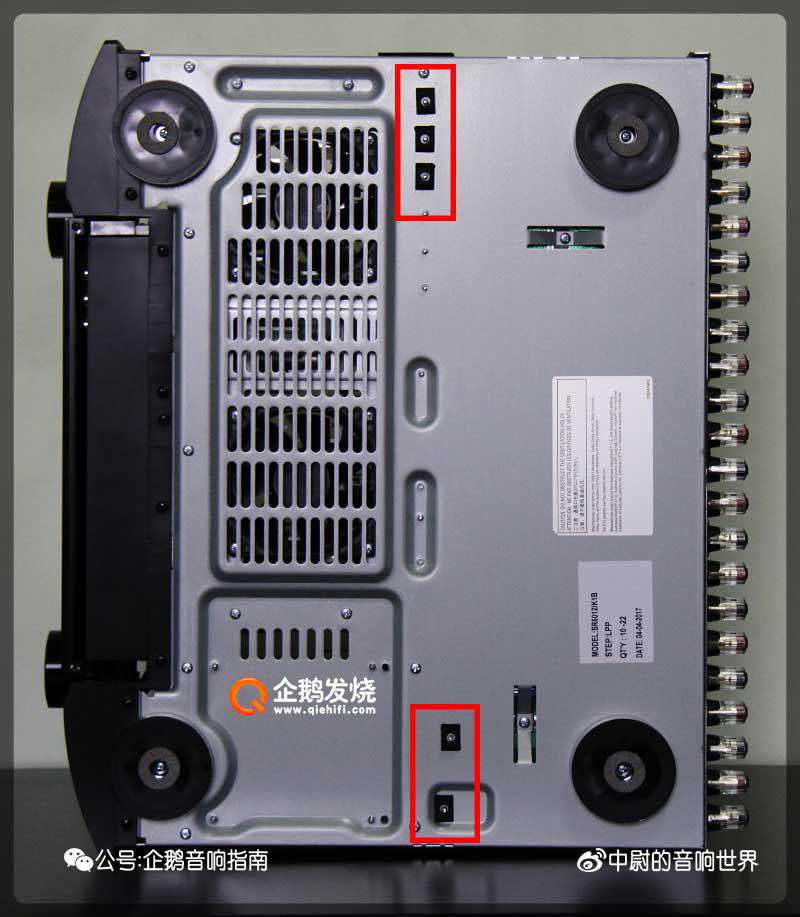 在机器底部,照片中的红框位置,有5个小螺丝,每个螺丝固定了一只运放芯片,应该是借用底板来协助散热的。因此,在使用SR6012的过程中,一定要确保有较好的通风环境。