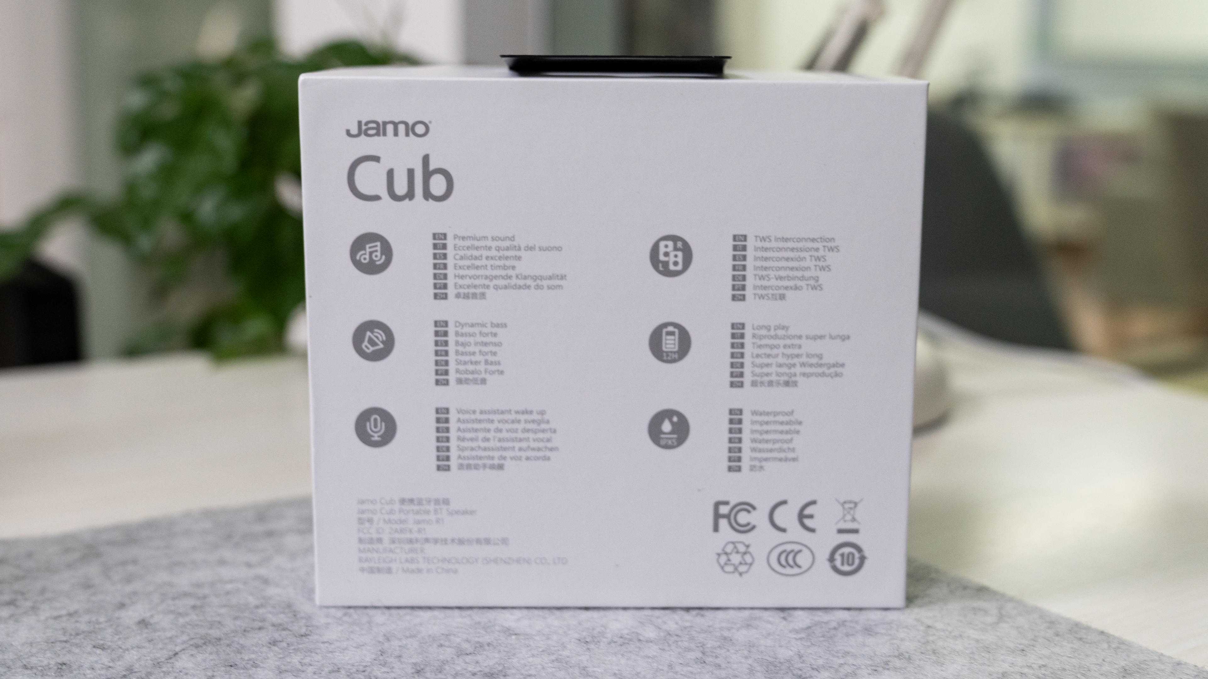 透明的包装上可以看到JamoCub尊宝小方盒的产品LOGO,以及它的产品特点,包括美妙音质、TWS互联、强劲低音、12小时续航、语音助手以及IPX5级防水。