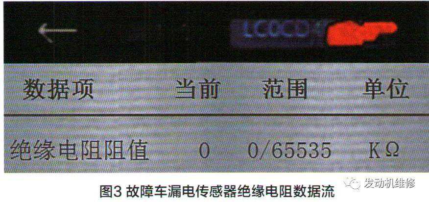 检测漏电传感器的数据流发现其电阻为0(图3),明显异常。尝试清除故障码,重新调取故障和数据流,没有任何变化,车辆仍不能使用纯电驱动模式。这说明故障车“EV功能受限”的原因是“严重漏电”造成的。