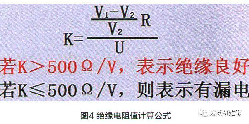 “当量绝缘值”是用1V电压的绝缘电阻不得低于500Ω(即500Ω/V)来计算的。当绝缘阻值大于或等于500Ω/V时,表示高压电路系统绝缘良好;若绝缘阻值在100~500Ω/V范围内,则表示一般漏电;若绝缘阻值小于或等于100Ω/V时,表示系统严重漏电。