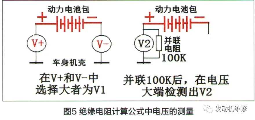 在图4所示公式中,先测量动力电池的正、负母线分别对车身机壳的电压v+及V-,在V+及V-中取大者作为V1。假设在正极端测量对车身的电压更高,则取V+为V1,而舍去V-;反之则取V-作为V1(图5)。然后在电压表两端并联一个100KΩ的电阻,再检测V1处的电压作为V2,再按公式计算出绝缘电阻值,并按规定对动力电池进行判断绝缘是否符合要求。
