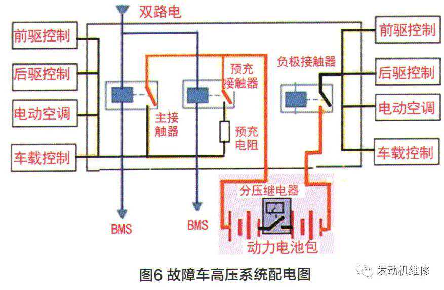 图6为故障车动力电池包一高压配电箱一各高压模块的总配电图,从中可以看出高压母线的走向。图中“双路电”是蓄电池的低压电,控制给各继电器的电源,也就是用低压电来控制高压电。只有双路电的电源正常,才可供给高压电给各高压负载的电源。图中橙色线为动力高压电的正、负母线。