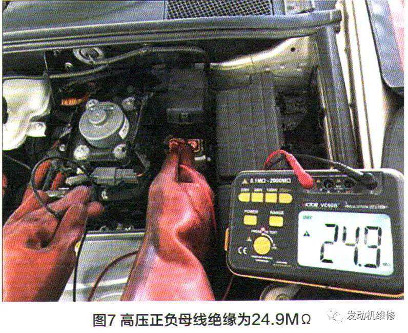 1.测得母线正极与负极对车身绝缘阻值均在24.9MΩ(图7)以上,远大于500Ω/V的漏电的标准检验值,证明后驱动电机控制器、空调配电盒、车载充电器以及母线束的绝缘良好,没有漏电的故障;