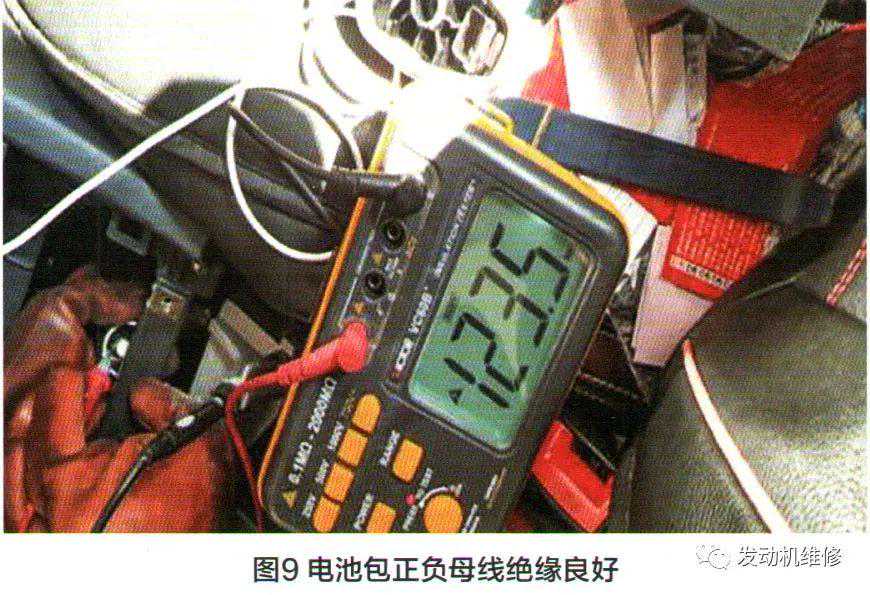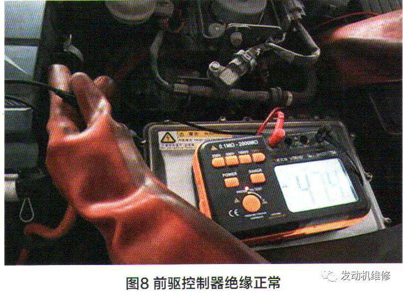 4.断开前驱动电机控制器的高压输出端,用兆欧表分别测量前电机的A相、B相、C相对地绝缘阻值均为无穷大,排除前电机的漏电;用同样的方法去测量后电机的A相、B相、C相对地绝缘阻值也是无穷大,排除了后电机绝缘故障;