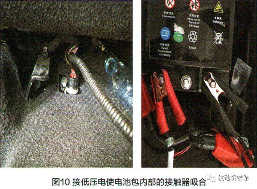 1.在驾驶座椅下方,找到动力电池包的低压接插头,在副驾驶座椅下方有蓄电池,接12V电源使电池包内部的分压接触器吸合(图10);