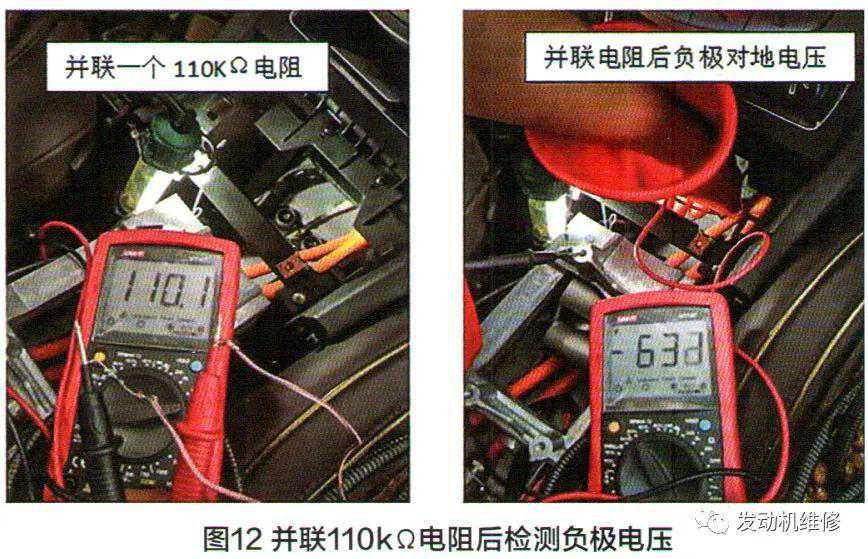3.在万用表的两表笔之间并联一个110kΩ的电阻后,再检测电池包的负极对车身机壳的电压,得测量值为631V(图12),作为计算绝缘电阻公式中的V2电压;