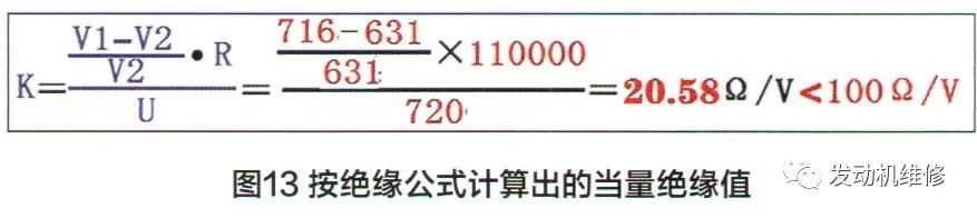 4.按电动汽车国际规定的绝缘漏电公式进行计算,得出当量绝缘值为20.58Ω/V(图13),电池包内部的绝缘电阻过小,说明动力电池包内部确实存在严重漏电的故障。
