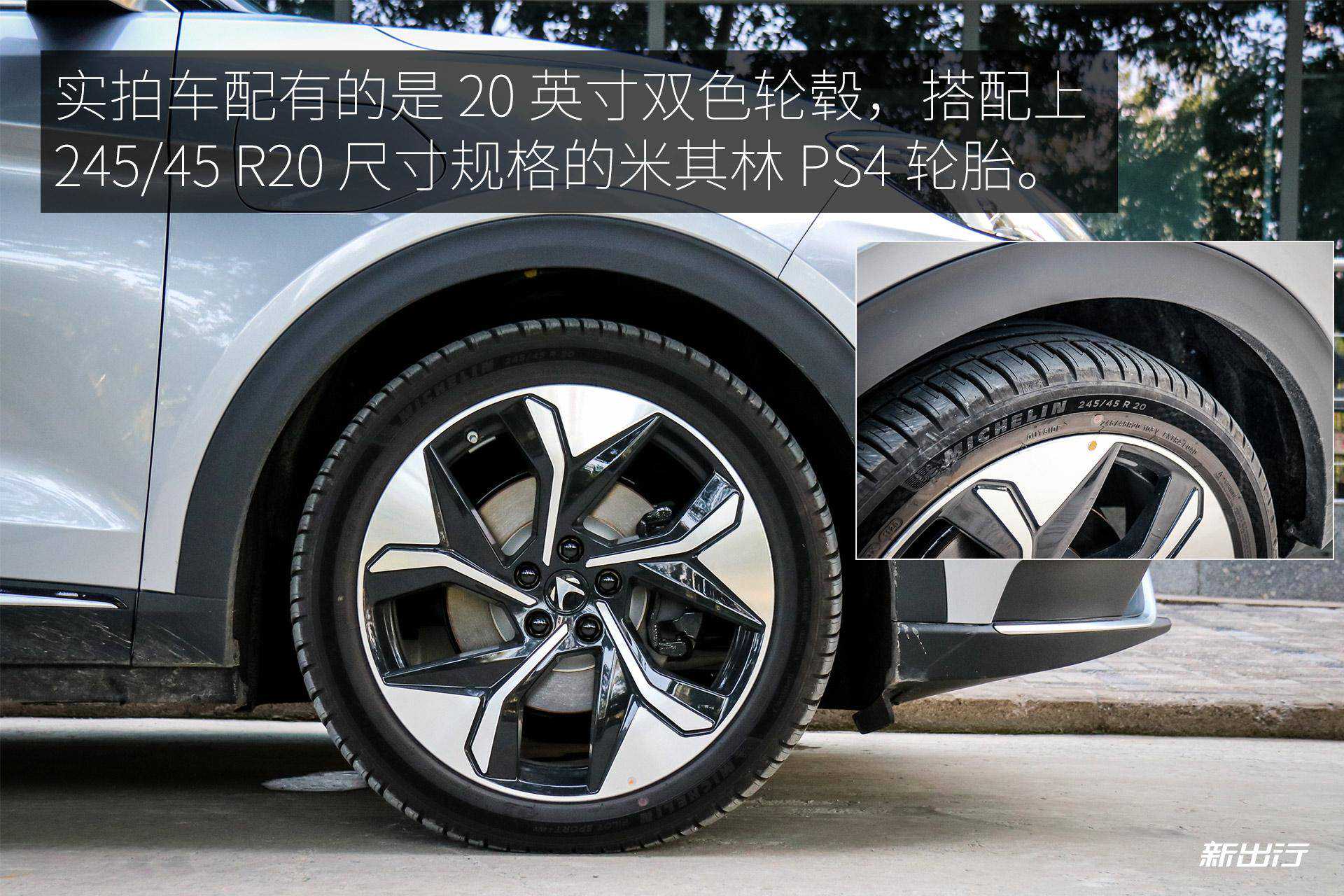 车身尺寸方面,新车长宽高分别为4788×1940×1683mm,轴距为2915mm。同时,实拍车配有的是20英寸双色轮毂,搭配上245/45R20尺寸规格的米其林PS4轮胎。